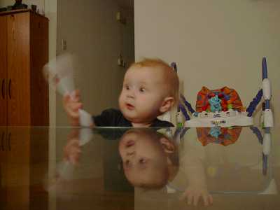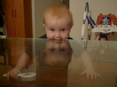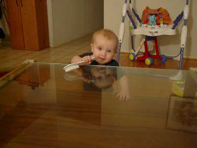 Great Grandma Ginga's coffee table is one of Gabriel's best walking/standing aids