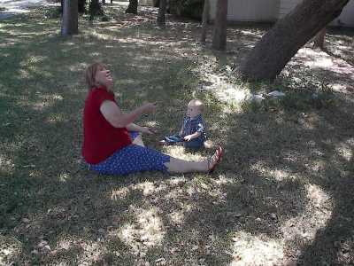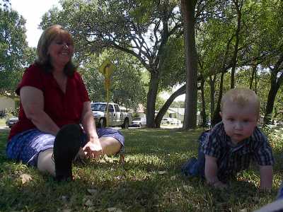 Playing with Grandma Vasquez in the front yard at home
